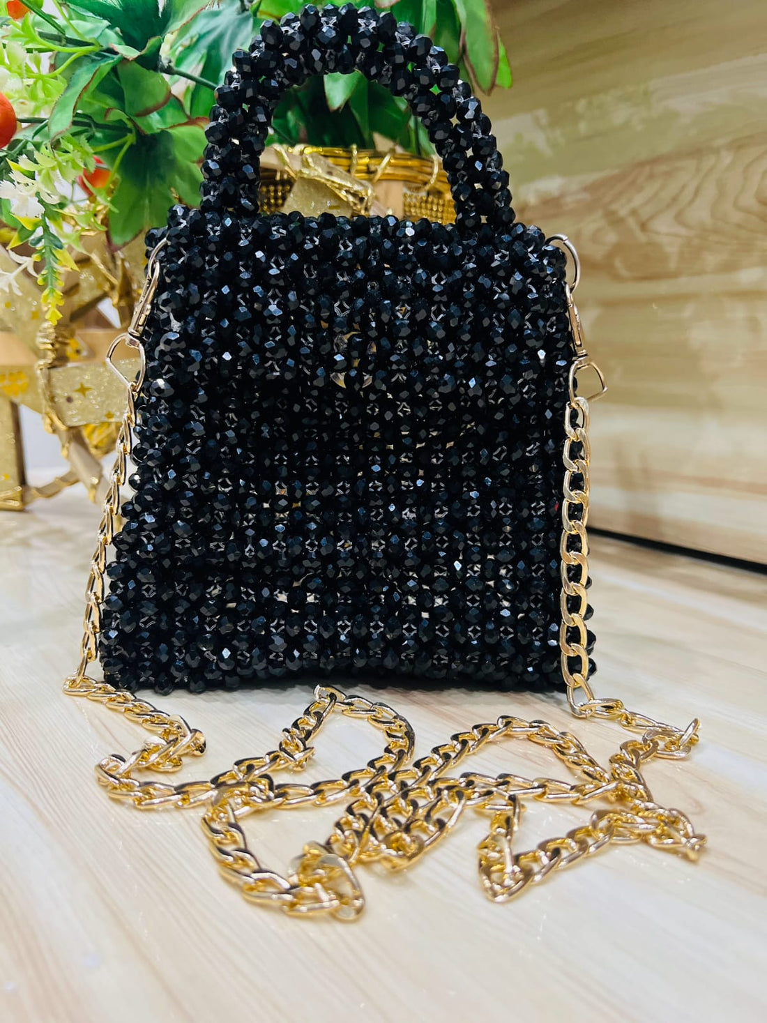 Elite Black Crystal Beaded Handbag with Gold Chain | Pearls by Zainab