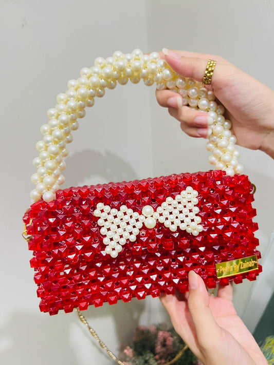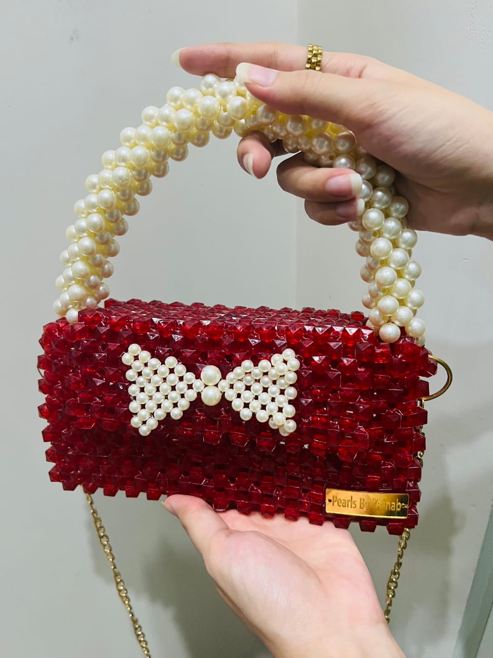 Handcrafted Red Crystal Pearl-Handle Handbag with Pearl Bow – Luxury Party & Evening Purse | Pearls By Zainab