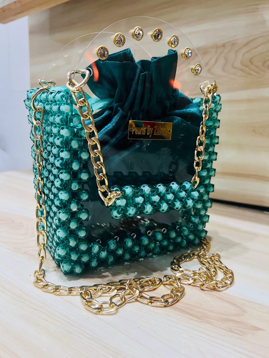 Emerald Crystal Beaded Acrylic Handbag with Gold Chain – Premium Edition | Pearls by Zainab